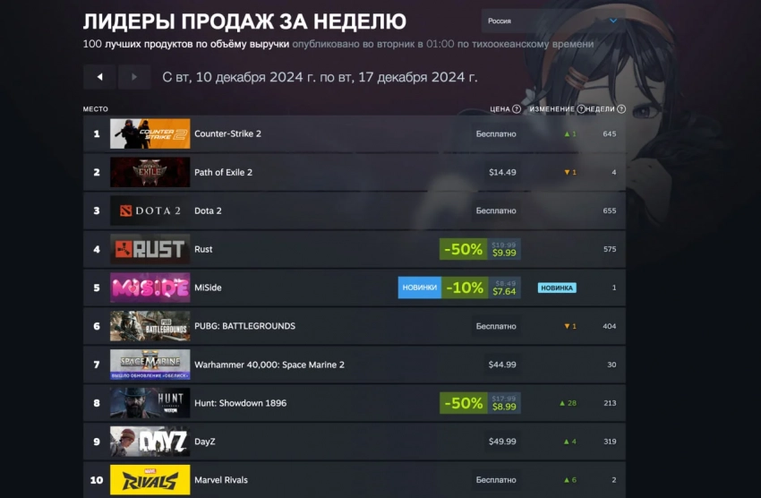 Первое место CS2 заняла и в топе России, а единственной новинкой подборки оказалась ролевое приключение с элементами хоррора MiSide (5 место).