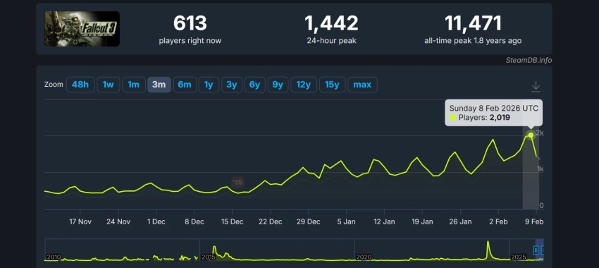 Полное издание Fallout 3 привлекло более двух тысяч человек на пике онлайна 8 февраля. В апреле 2024 года пик превышал 15 тысяч игроков. А вот Fallout: New Vegas связана со вторым сезоном «Фоллаута» тематически, поэтому удивляться высоким показателям не стоит — 8 февраля игра приблизилась к отметке онлайна в 28 тысяч геймеров одновременно.
