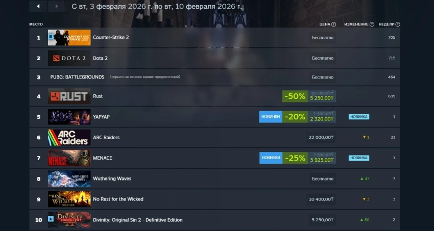 MENACE также вошла и в первую десятку чарта российского сегмента Steam, заняв седьмую строчку. А на пятом месте расположилась ещё одна новинка недели — кооперативная YAPYAP, которая может похвастаться поддержкой голосовых команд. Wuthering Waves также вошла в топ-10 — для достижения восьмой строчки понадобилось подняться на 47 позиций.