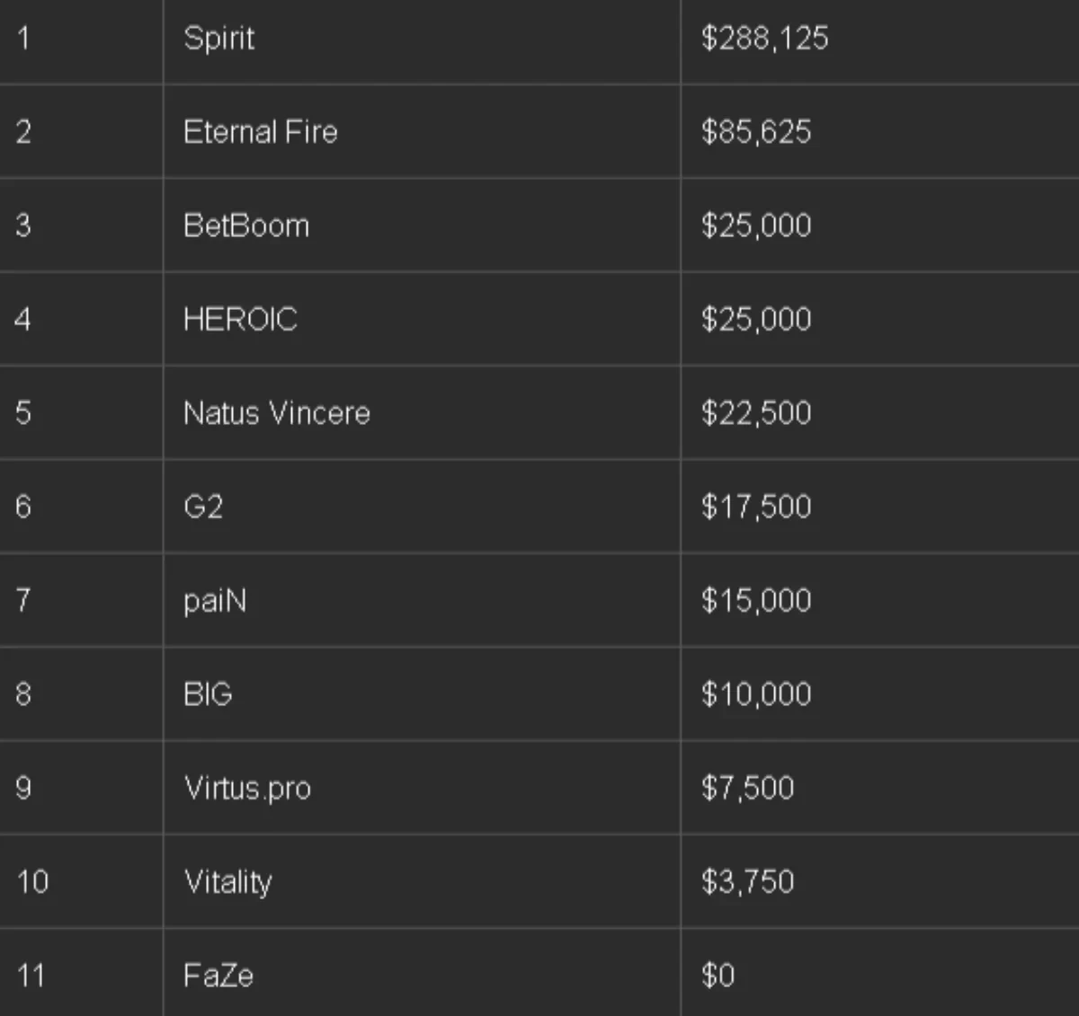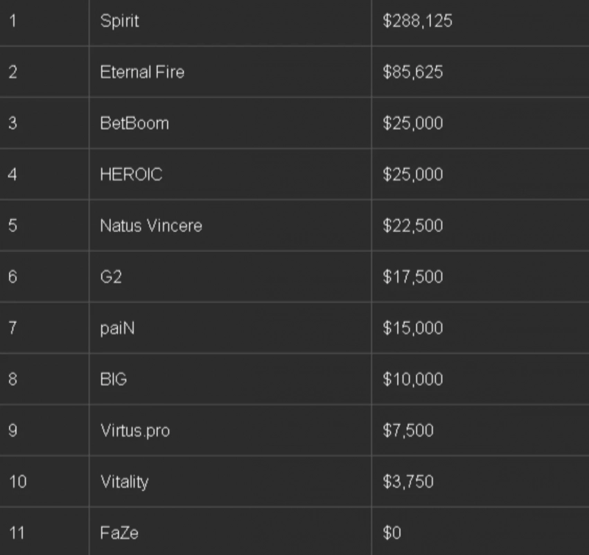 Призовой фонд BLAST Bounty Spring 2025 составил 500,000$. Spirit, одержавшая победу в гранд-финале, получила 288,125$, в то время как Eternal Fire пришлось довольствоваться более скромными 85,625$.