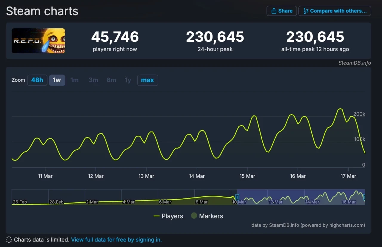 R.E.P.O. приобрела большую популярность благодаря сарафанному радио — пик онлайна новинки в Steam уже перевалил за 230 тысяч человек.