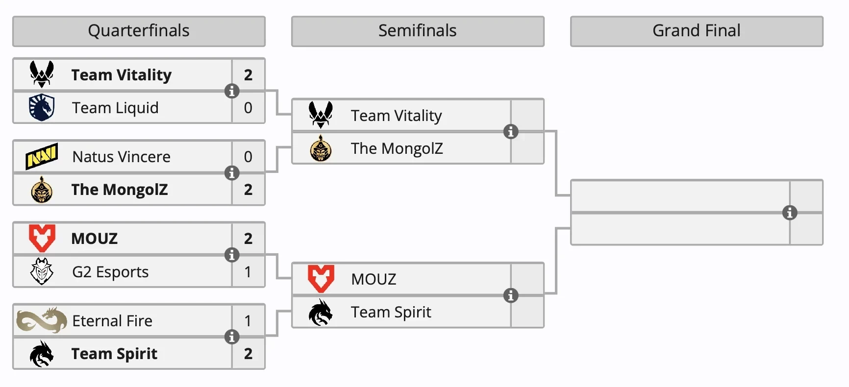 15 марта пройдут полуфинальные встречи: Team Vitality встретится с The MongolZ, а MOUZ сыграет против Team Spirit. Победители выйдут в финал, а проигравшие завершат участие в турнире.
