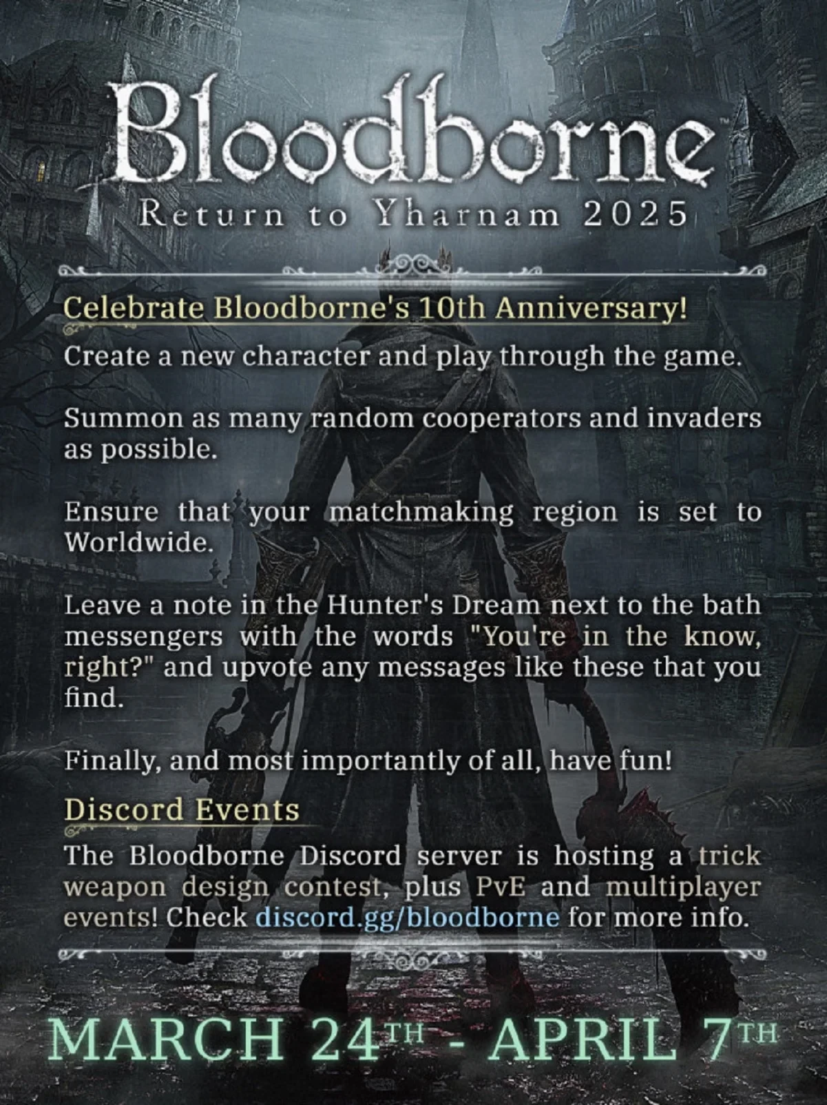 Суть фанатского ивента проста — проводить время в Bloodborne и просто веселиться, не отключая многопользовательские функции. Игрокам нужно как можно чаще призывать случайных напарников и вторгаться в чужие миры. Рекомендуется создать нового персонажа, а также включить матчмейкинг по всему миру — так отыскать игроков будет проще.