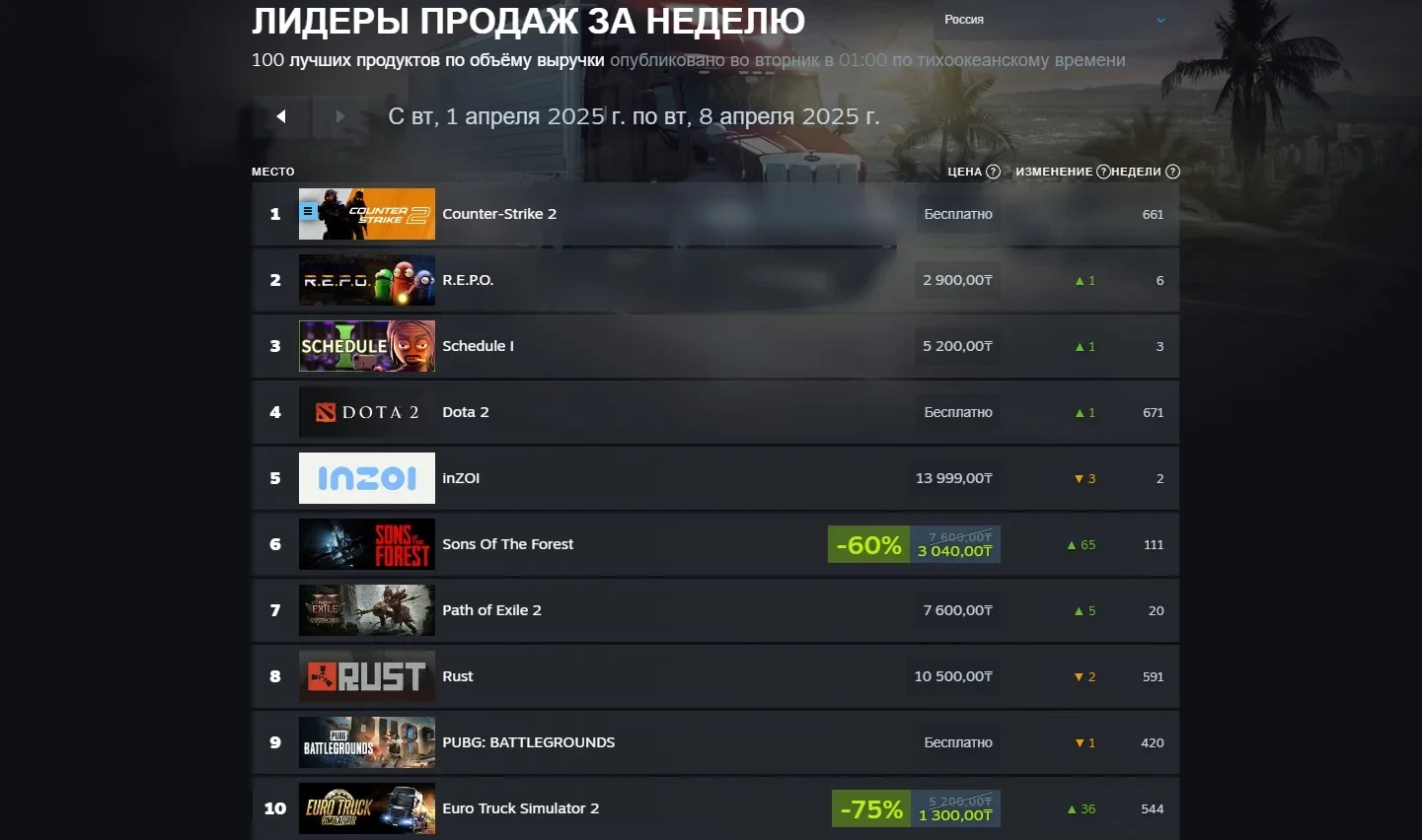 Также рассмотрим российский сегмент Steam. Лидером осталась Counter-Strike 2, а на четвёртом месте расположилась ещё одна условно-бесплатная игра Valve — Dota 2. Также отечественные игроки заинтересовались inZOI, которая находится на пятом месте.