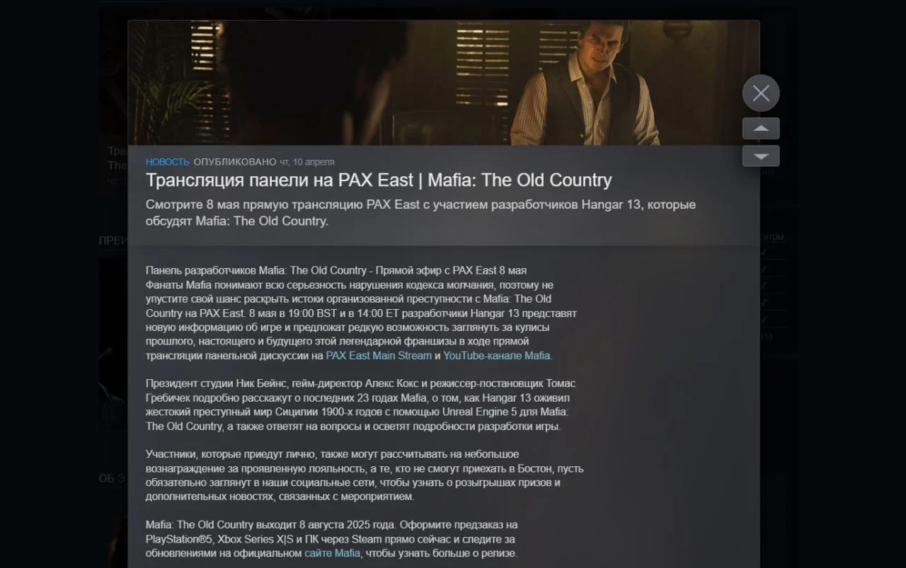 Ещё больше интересных видео на YouTube канале Игромании!Hangar 13 случайно раскрыла дату выхода Mafia: The Old Country — 8 августа 2025 года. Информация появилась в новости на странице игры в Steam, посвящённой предстоящей презентации проекта на выставке PAX East, которая пройдёт 8 мая. При этом официального подтверждения даты релиза от 2K и разработчиков пока не поступало.