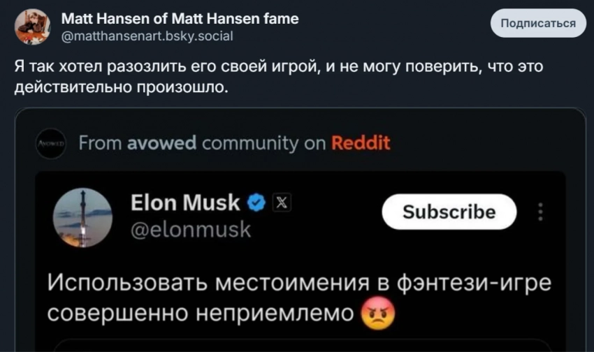 Стоит отметить, что заявление было сделано спустя несколько часов после конфликта с Мэттом Хансеном — креативным директором фэнтезийной RPG Avowed от Obsidian Entertainment. Причиной возникновения спора стала негативная реакция бизнесмена на использование гендерных местоимений в самой игре.