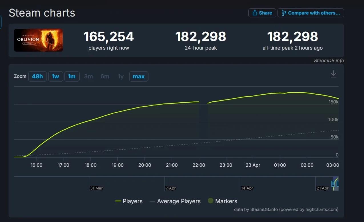 В Steam пиковый онлайн The Elder Scrolls 4: Oblivion Remastered успел вырасти до 182 298 игроков одновременно. Местным лидером в рамках серии остаётся The Elder Scrolls V: Skyrim с его пиком в 287 411 игроков одновременно.