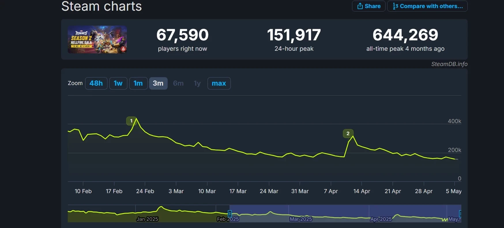 За последние 24 часа 6 мая пиковый онлайн Marvel Rivals в Steam составил менее 152 тысяч человек. Это антирекорд с момента релиза 6 декабря 2024 года. Вскоре после выхода в шутере одновременно находилось 480 тысяч игроков на пике, а 11 января, после старта первого полноценного сезона, пиковый онлайн в Steam превысил 644 тысяч человек — это остаётся рекордом игры.