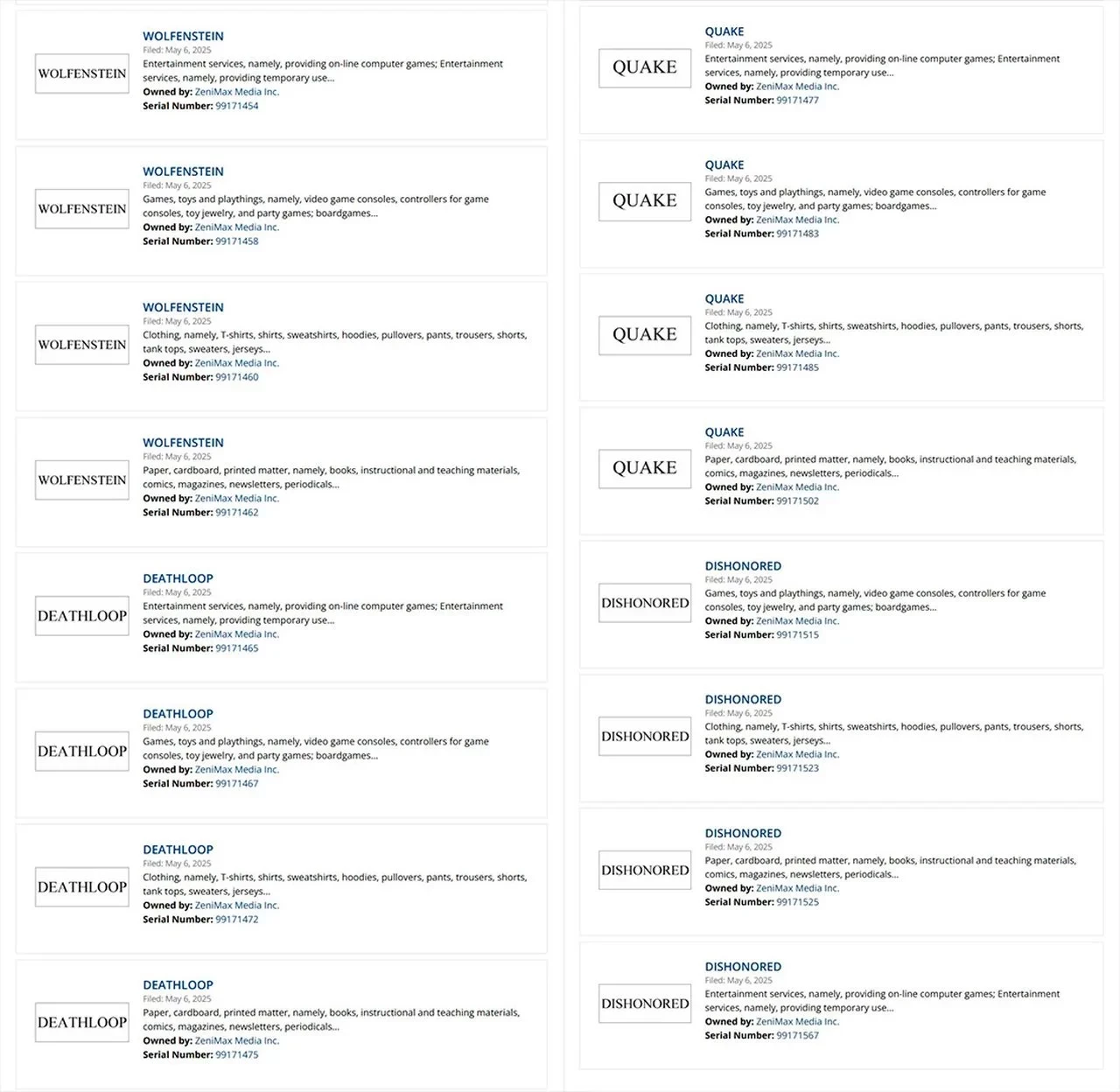 Насколько можно судить, свидетельств планов на развитии игровых серий в новых заявках не содержится. Судя по всему, ZeniMax решила обезопасить популярные названия от появления коллекций пижам и нижнего белья под маркой Dishonored или Deathloop.