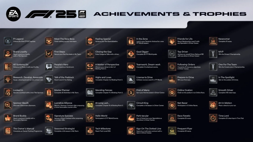 Заодно был раскрыт список достижений. Разработчики специально составили его таким образом, чтобы для прохождения F1 25 на 100% пришлось ознакомиться со всеми аспектами гоночной игры. Некоторые достижения, вроде тюнинга болида или завершения заездов, можно было получить в играх прошлых лет.