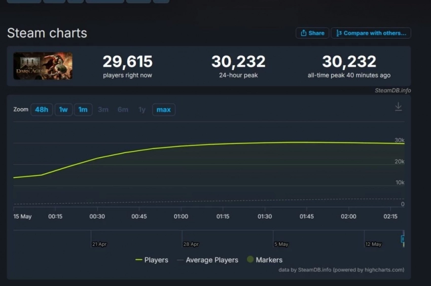 На момент написания новости пиковый онлайн DOOM: The Dark Ages в Steam составил 30 232 игрока одновременно. Это третий лучший результат в рамках серии: