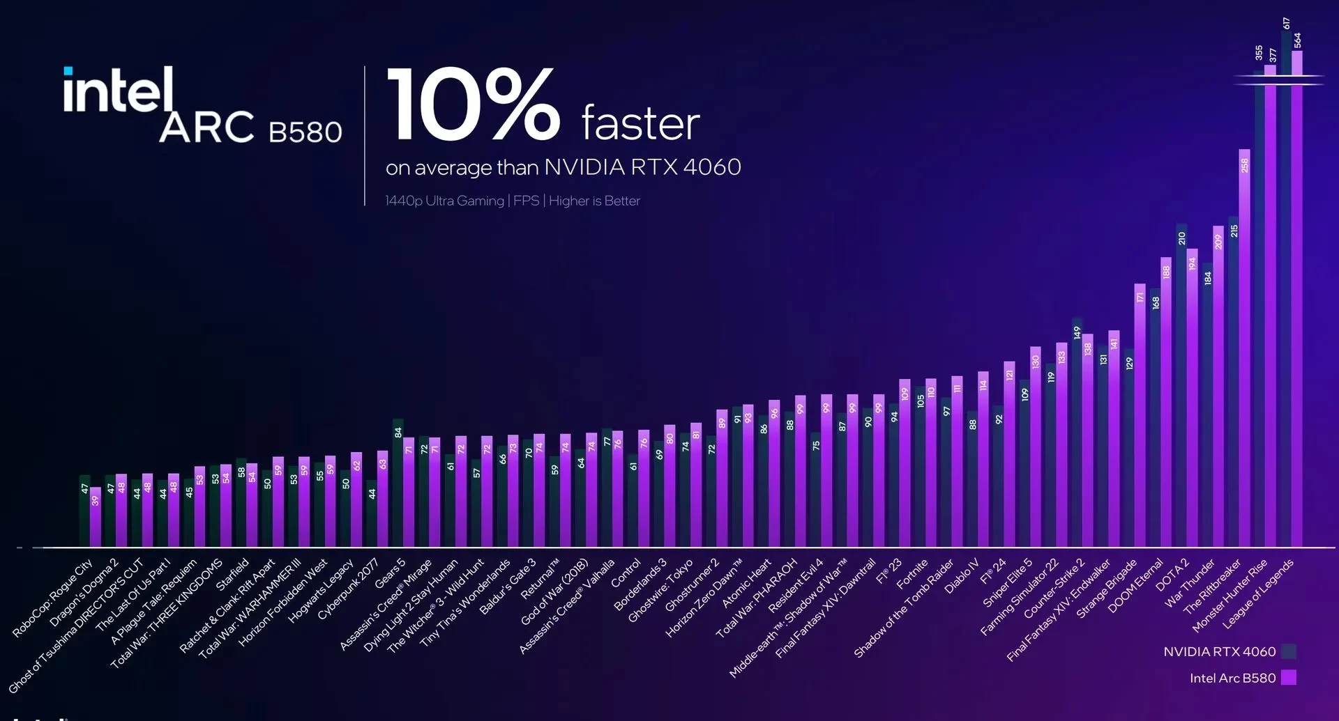 Intel утверждает, что B580 работает в среднем на 10% быстрее, чем RTX 4060, если совместить её с дорогим процессором Intel Core i9-14900K. В Cyberpunk 2077, Hogwarts Legacy, Returnal и The Witcher 3 это комбо может выдать в среднем 60 кадров в секунду при 1440p и ультра-настройках.
