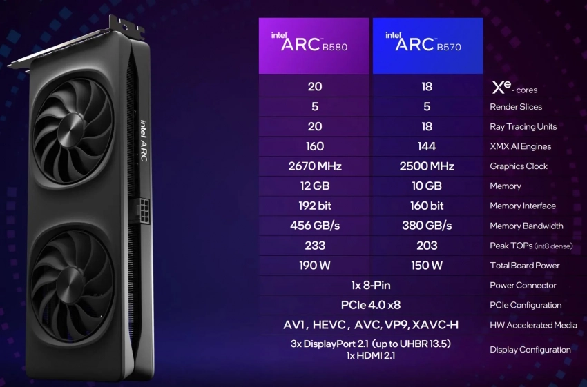 Arc B580 за 249 долларов поступит на рынок 13 декабря, а 16 января к ней присоединится Arc B570 за 219 долларов. Обе они основаны на архитектуре GPU Xe2 Battlemage, которая использовалась в чипах Intel для ноутбуков Lunar Lake. Но в новых картах — более чем вдвое больше графических ядер, а также до 12 Гб видеопамяти и до 190 Вт мощности.