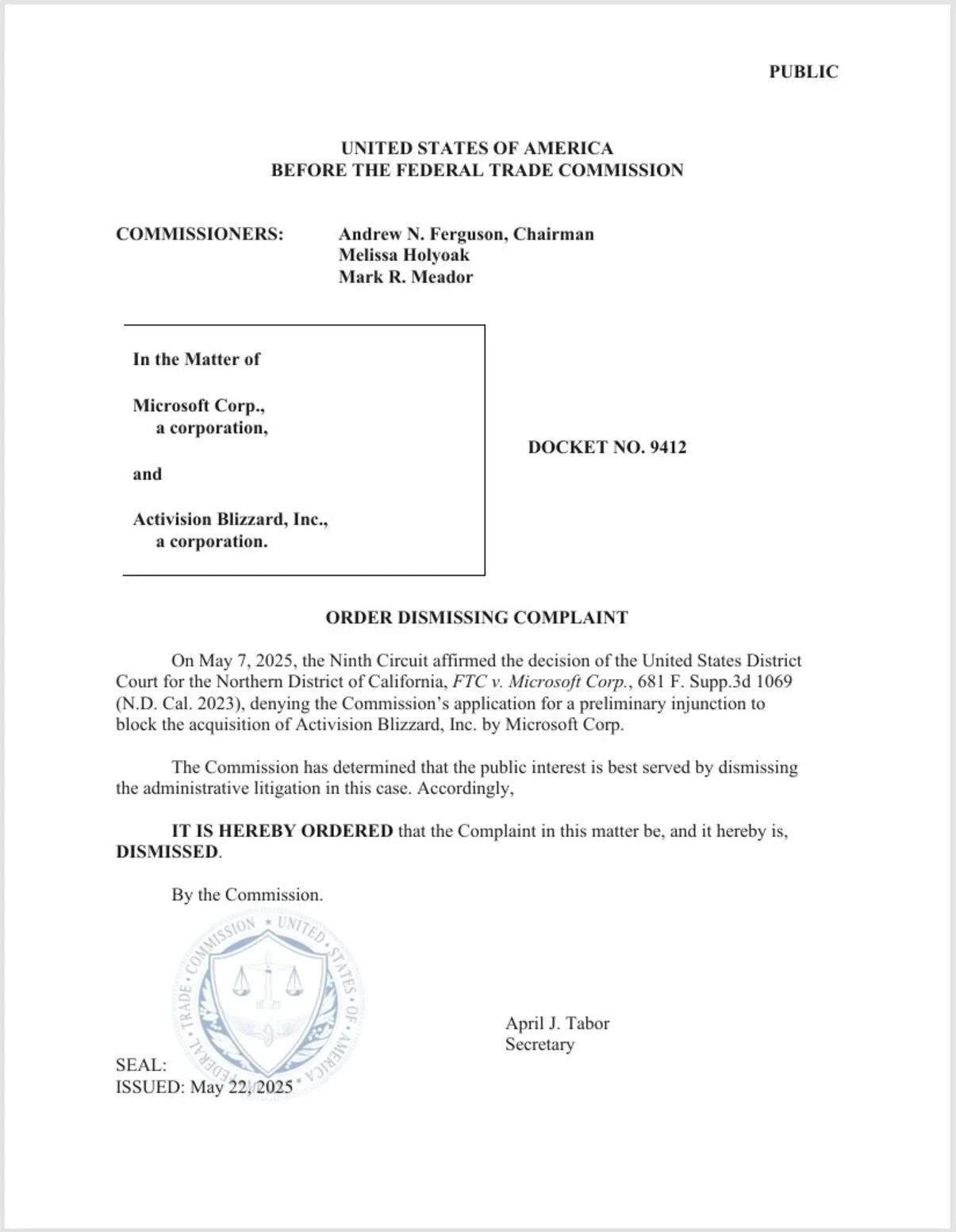 В документах FTC указано, что «в интересах общества лучше всего закрыть административное дело». Это означает окончательное завершение почти двухлетней юридической борьбы, в ходе которой ведомство пыталось не допустить слияние компаний — цена вопроса составляла 68,7 млрд долларов.