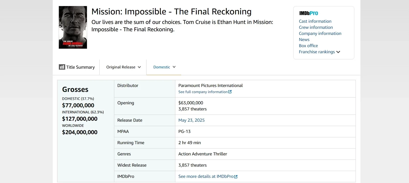 Тем временем «Миссия невыполнима: Финальная расплата» с Томом Крузом показала лучший старт в прокате среди других фильмов франшизы.