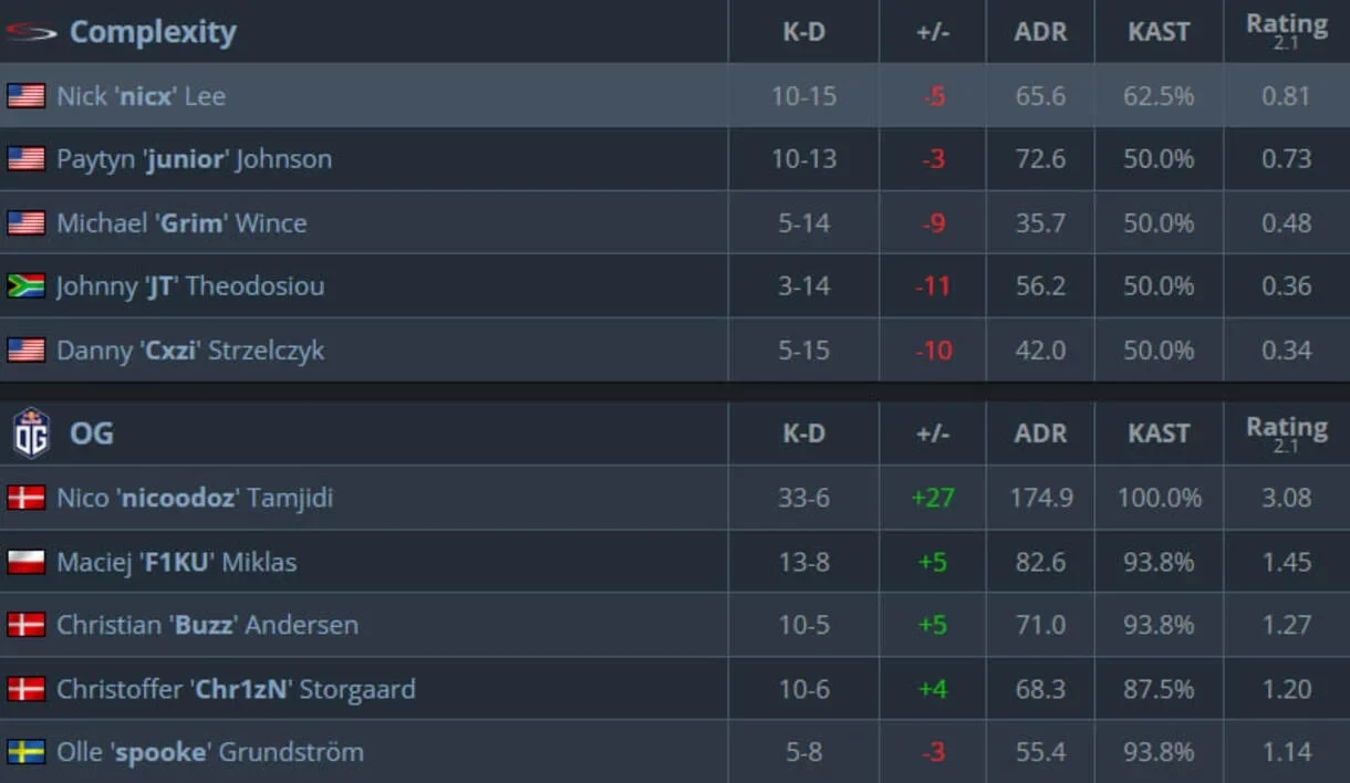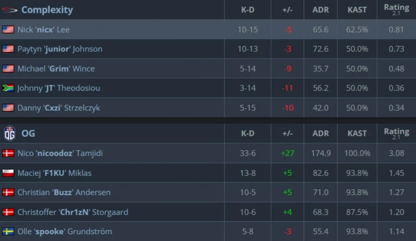 Команда OG закончила игру со счетом 13:3. Нико настрелял потрясающий рейтинг 3.08, что значительно превышает его предыдущий рекорд на LAN в 2.20, установленный в локальном матче на квалификации BYOC Copenhagen Games 2017.