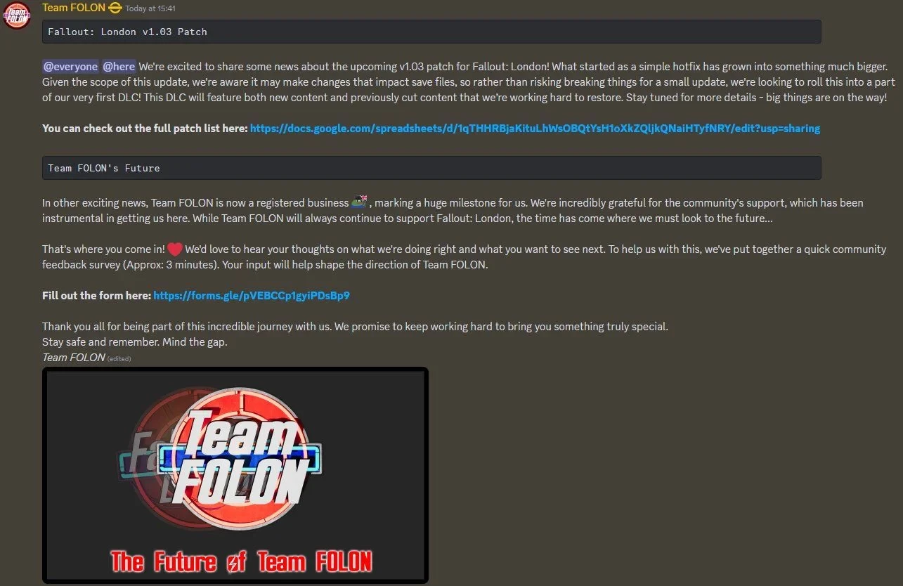 Ещё больше интересных видео на YouTube канале Игромании!Скриншот Fallout: LondonКоманда энтузиастов Team Folon объявила, что достигла новой значительной вехи: теперь она стала настоящей студией, «зарегистрированным предприятием». И, чтобы лучше понять, в каком направлении продолжать поддерживать успешную модификацию, Fallout: London, разработчики попросили игроков заполнить опросник.