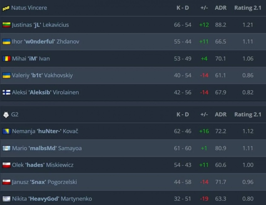 Матч против G2 оказался непростой задачей. На карте Mirage Natus Vincere с трудом добилась преимущества, благодаря индивидуальным усилиям Юстинаса «jL» Лекавичюса и Михая «iM» Ивана. Хотя команда увеличила своё лидерство, выиграв пистолетный раунд, G2 почти вернулась в игру, но всё же уступила со счётом 13:10.