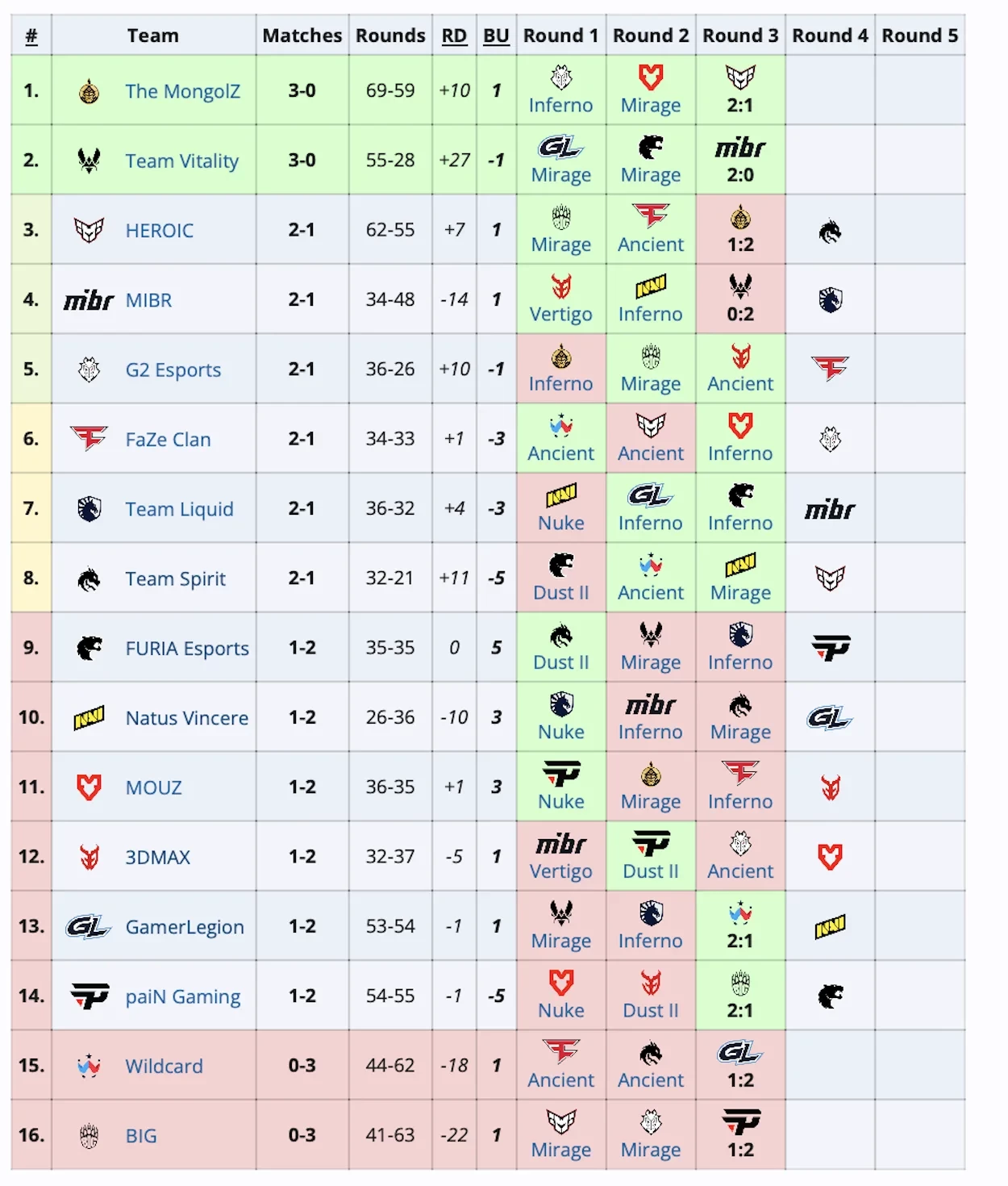 И если для этих коллективов все сложилось удачно, то Wildcard и BIG покинули турнир. Они проиграли по три поединка. Остальные команды остаются в середине таблицы.