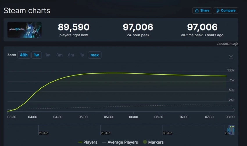 Тем временем пиковый онлайн Mecha Break в Steam достиг 97 006 игроков одновременно. При этом во время февральской беты шутер привлёк 317 тыс человек одновременно! Наигрались?