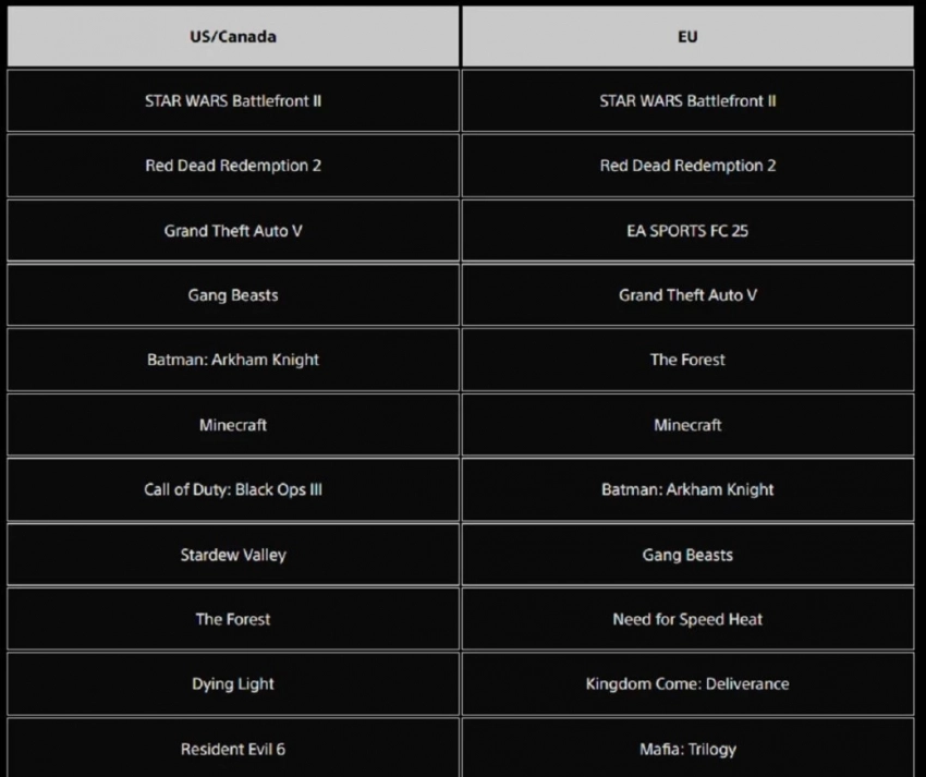 Новинок для прошлого поколения консолей выходит не так уж много, поэтому топ загрузок под завязку набит золотой классикой. Например, геймеры активно скачивали God of War (2018), а анонс девятой части наверняка привлёк внимание к Resident Evil 6 и Resident Evil 5.