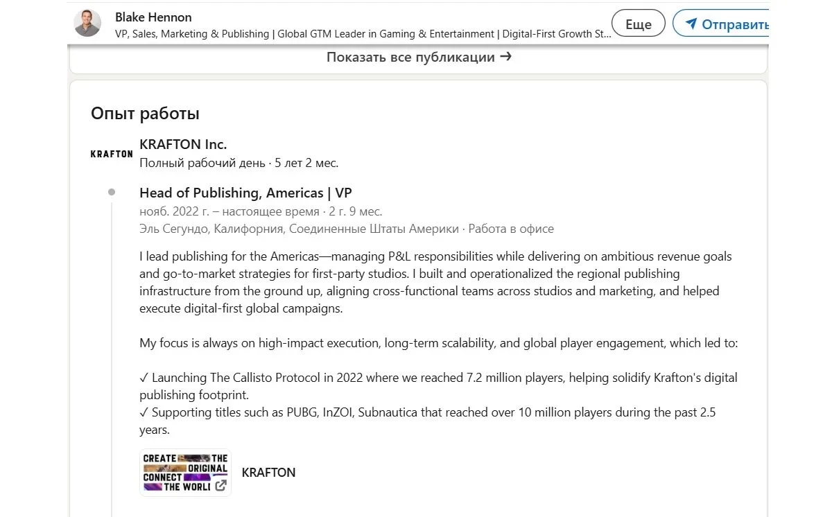 Глава американского издательского отделения Krafton Блейк Хеннон в своём профиле на LinkedIn указал, что участвовал в запуске The Callisto Protocol в 2022 году. И привёл показатели: игра привлекла 7,2 миллионов игроков, «помогая укрепить присутствие Krafton в цифровом издательстве».