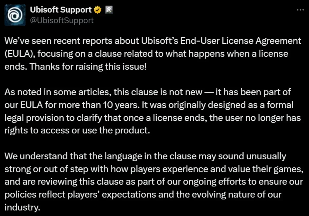 Ubisoft признала, что формулировка может показаться излишне суровой и устаревшей. Компания пообещала пересмотреть текст, чтобы он соответствовал ожиданиям пользователей и реалиям современной игровой индустрии.