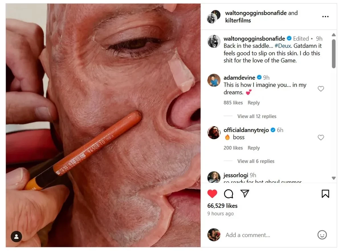 Процесс наложения грима бессмертного мутанта Гоггинс на днях показал в первом фото со съёмочной площадки. И приписал, что занимается всем этим исключительно из любви к Игре. Впрочем, ранее он заявлял, что не хочет, чтобы на его исполнение роли Гуля повлияли игры серии Fallout. Вместо этого он опирался на классические вестерны с Джоном Уэйном и Клинтом Иствудом.
