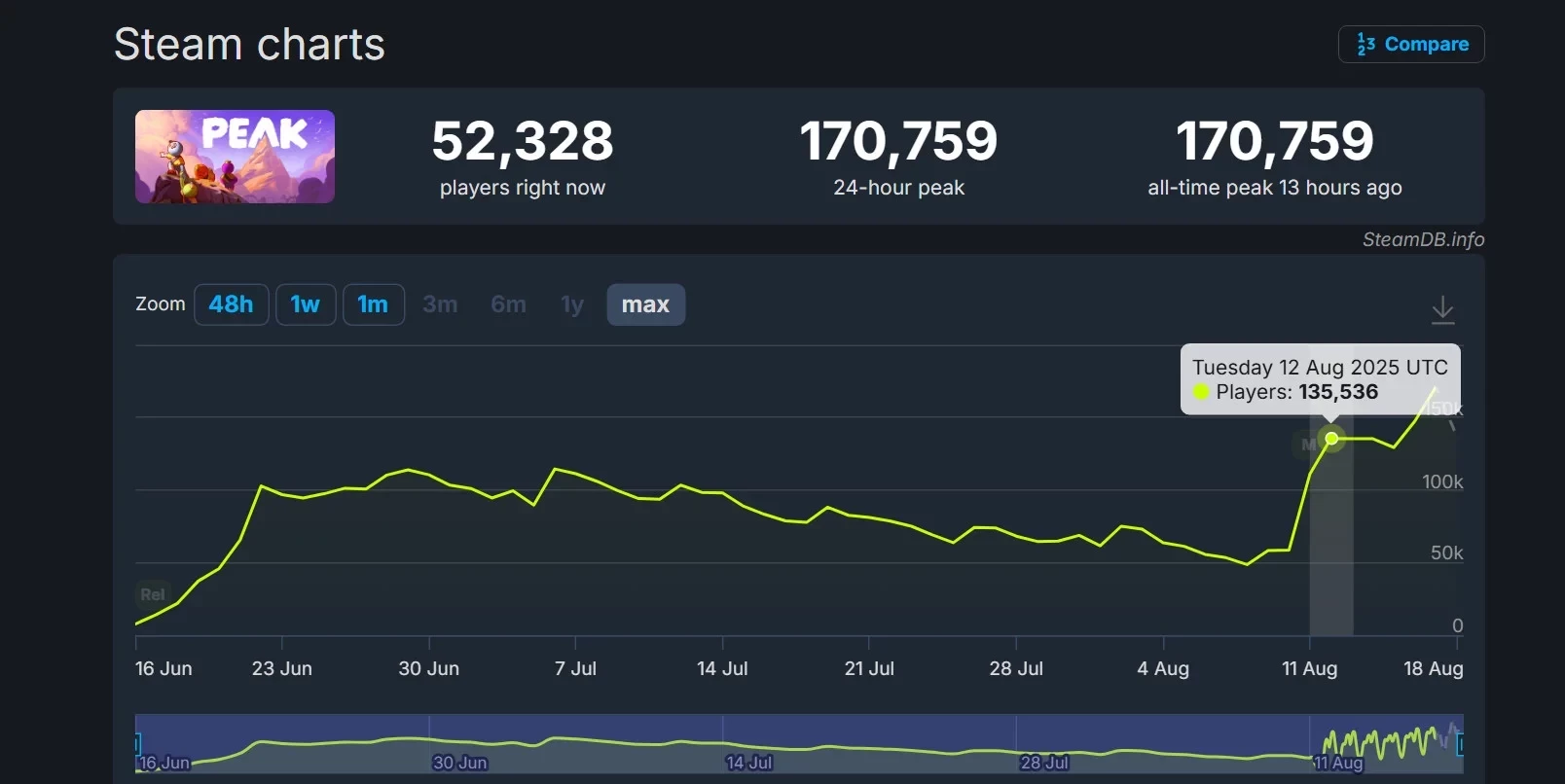 Кооперативная Peak обновила свой рекорд онлайна в Steam — свыше 170 тысяч человек