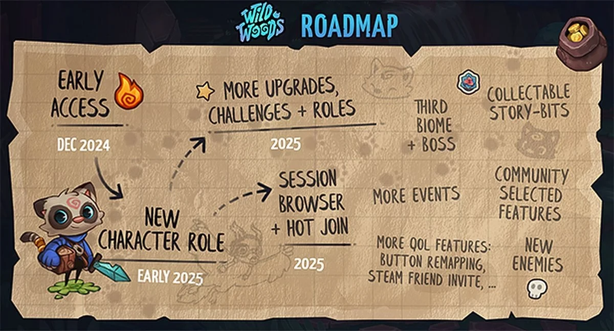 Сюжет Wild Woods прост: милые котики катят через полный опасностей лес тележку со своим немудрёным скарбом. А игроки, собравшись в компании по четыре человека, должны охранять их и защищать от кроликов и барсуков. Враги нападают по ночам, а днём можно собирать ресурсы для улучшения фургончика и решать, какой дорогой отправиться дальше.