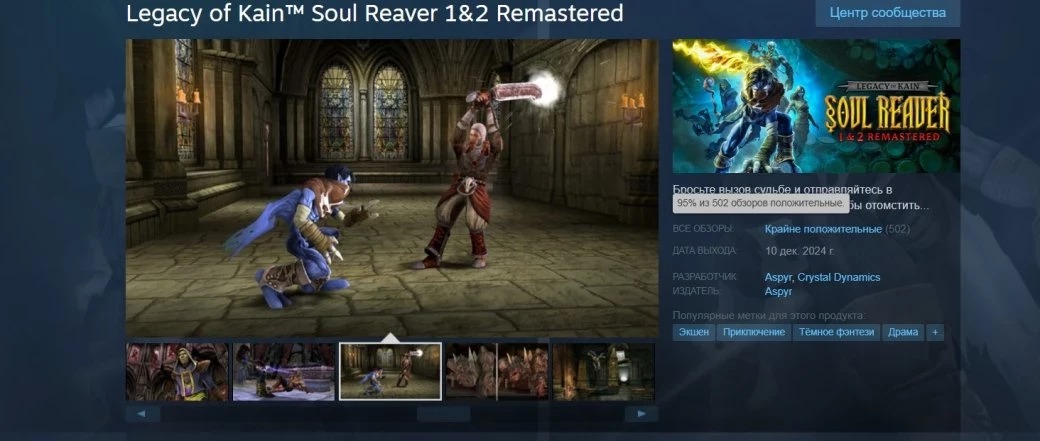 В Steam у Legacy of Kain Soul Reaver 1 & 2 Remastered уже «крайне положительный» рейтинг на основе 502 обзоров (95% рекомендуют игру к покупке). Пиковый онлайн достиг 4 227 игроков одновременно.