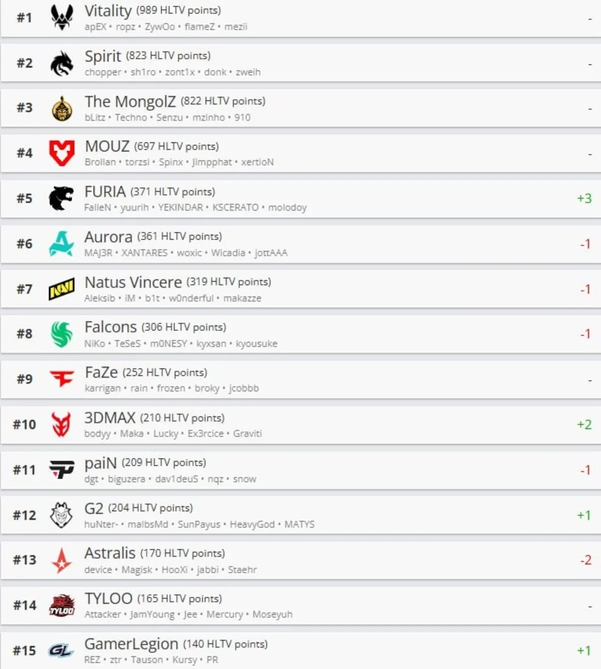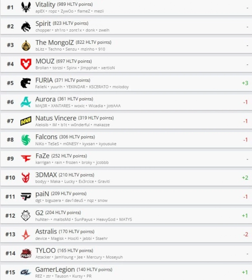 Team Vitality сохранила первое место (989 очков), Team Spirit — вторая (823), The MongolZ — третья (822), MOUZ — четвёртая (697). FURIA поднялась на пятое (371) и располагается выше Aurora Gaming (6-я), NAVI (7-я) и Falcons (8-я). Такой расклад — следствие отборов к BLAST Open London 2025.