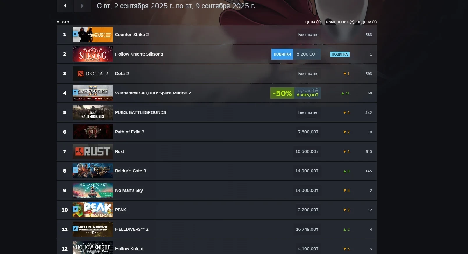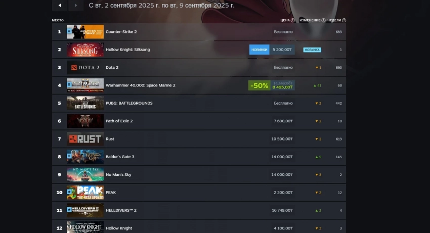 А вот в российском сегменте Steam лидером по выручке продолжает оставаться Counter-Strike 2, тогда как Hollow Knight: Silksong идёт лишь на втором месте. Заодно отечественные игроки проявили интерес к упомянутым выше Space Marine 2 и Baldur’s Gate 3.