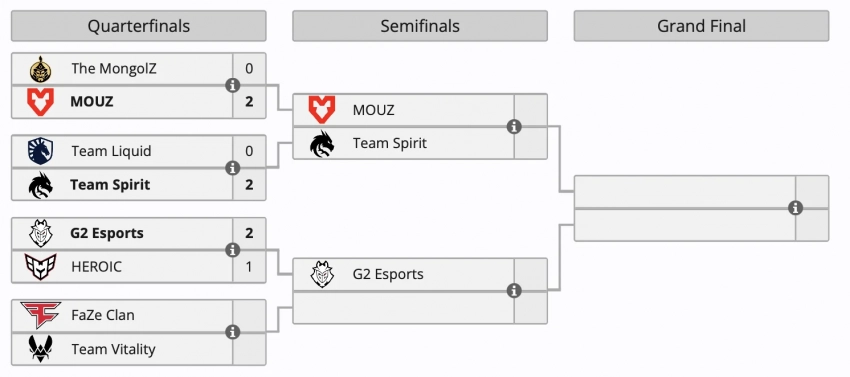 The MongolZ уступила MOUZ, а Team Liquid была слабее Team Spirit — оба поединка завершились со счетом 2:0. G2 Esports одолела HEROIC со счетом 2:1. Заключительный матч раунда — FaZe Clan и Team Vitality.