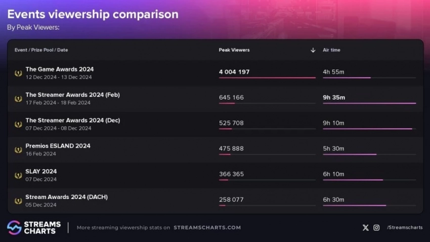 Шоу продемонстрировало стабильную аудиторию на протяжении почти пяти часов, достигая пика во время объявления победителя в номинации «Игра года». В результате премия зарегистрировала в свою копилку рекордные 15,2 млн часов просмотров и 3,1 млн зрителей в среднем. Отметим, что предыдущий рекорд составлял 3,6 млн пиковых зрителей, и принадлежал он прошлогоднему мероприятию.