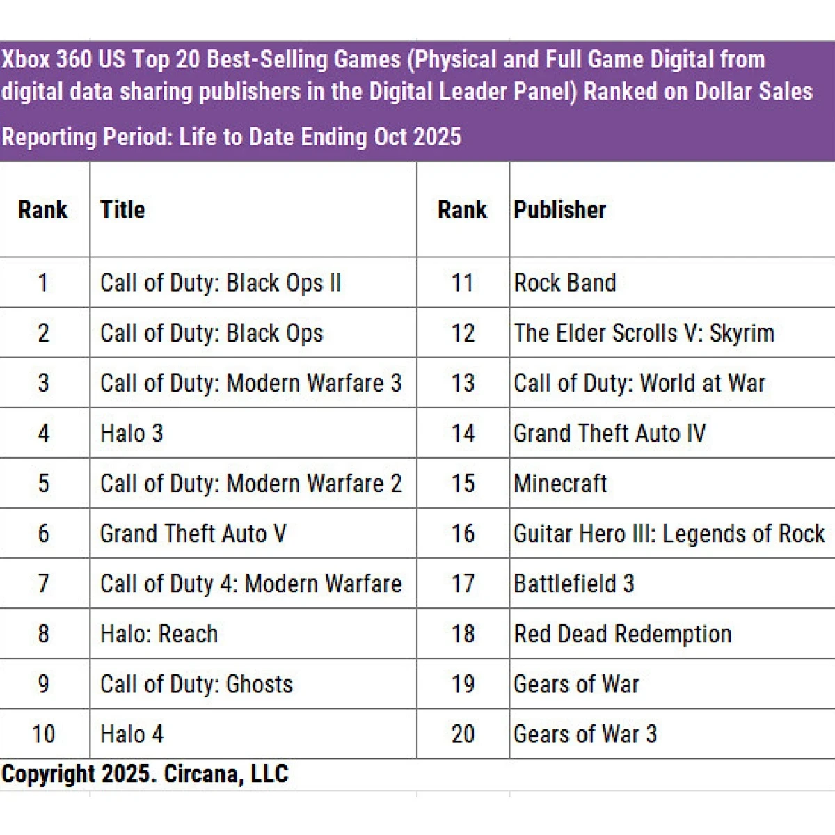 Самым успешным игровым проектом для платформы в США стала Call of Duty: Black Ops 2. Она возглавляет список бестселлеров как по количеству проданных копий, так и по общей выручке. За ней следует первая часть Black Ops, а также Modern Warfare 3.