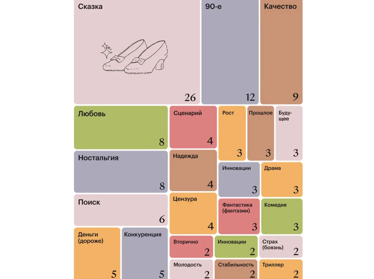 Главными словами в индустрии в 2024 году стали: «Сказка», «90-е» и «Качество». В топ тенденций ещё попали: «Любовь», «Ностальгия» и «Поиск».