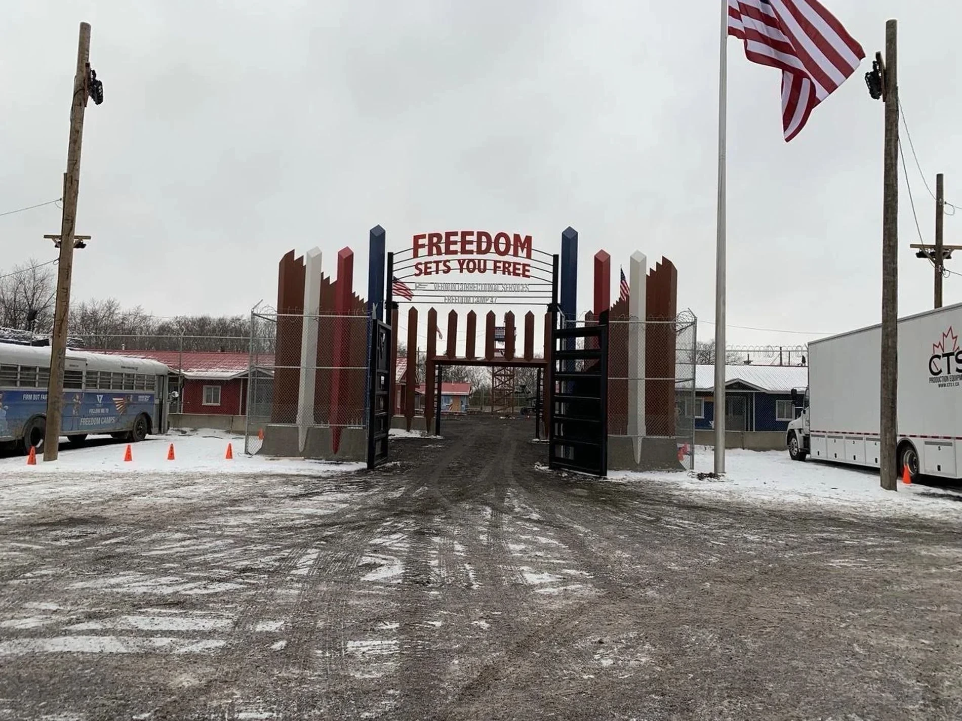 Фотографии показывают, какое будущее ожидает несогласных: «лагеря свободы», над входом в которые находится лозунг «Свобода освобождает», напоминающий о пресловутом «Труд освобождает» в концентрационных лагерях.