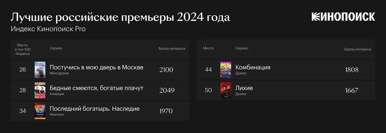 Самой громкой премьерой года на площадке стал российский сериал «Постучись в мою дверь в Москве», но он вообще не смог попасть в топ-20 и набрал в пять раз меньше баллов, чем «Слово».