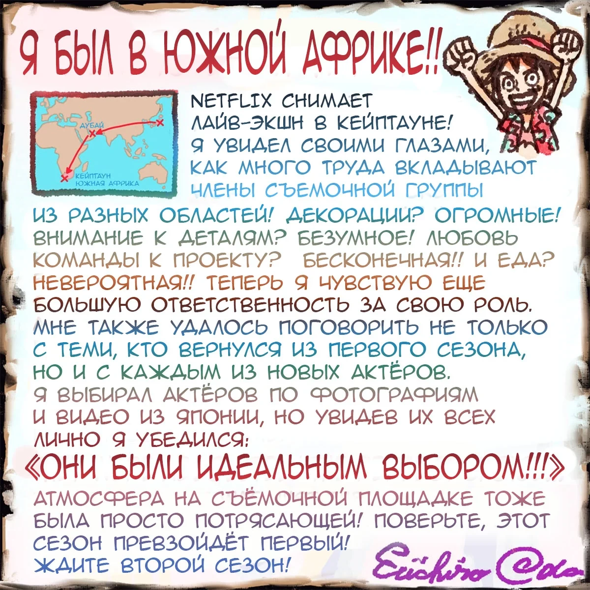 Netflix и Эйитиро Ода поделились кадрами со съемок второго сезона сериала One Piece
