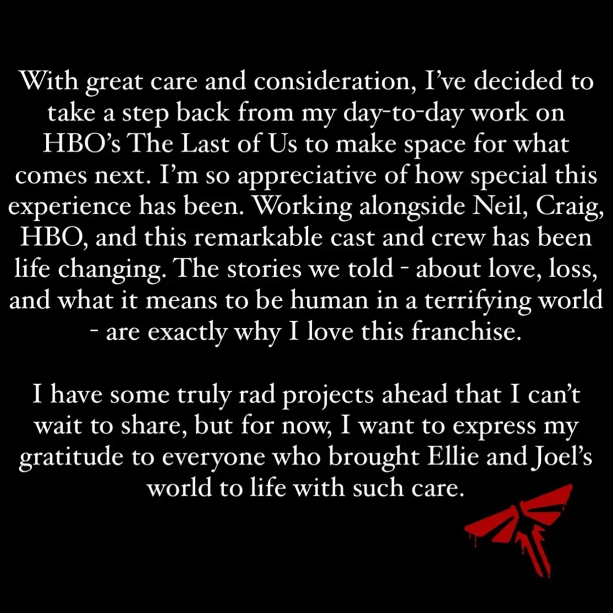 Кроме Дракманна, от работы над сериалом отказалась и Хэлли Гросс — соавтор сценария The Last of Us: Part II и сценаристка сериальной адаптации. Гросс отметила, что благодарна команде и зрителям за возможность рассказать такие личные и эмоциональные истории. Теперь она приступит к работе над другими творческими проектами.