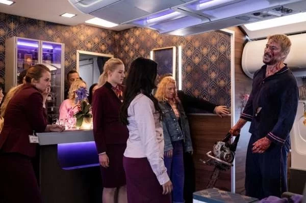 Да, «Рейс на вылет» — это сугубо развлекательное кино, что сразу понятно по открывающей сцене, где происходит самая настоящая кровавая свалка под классическую музыку. Всё однозначно плохо, но губы сами в улыбке растягиваются, ведь абсурдность происходящего зашкаливает.