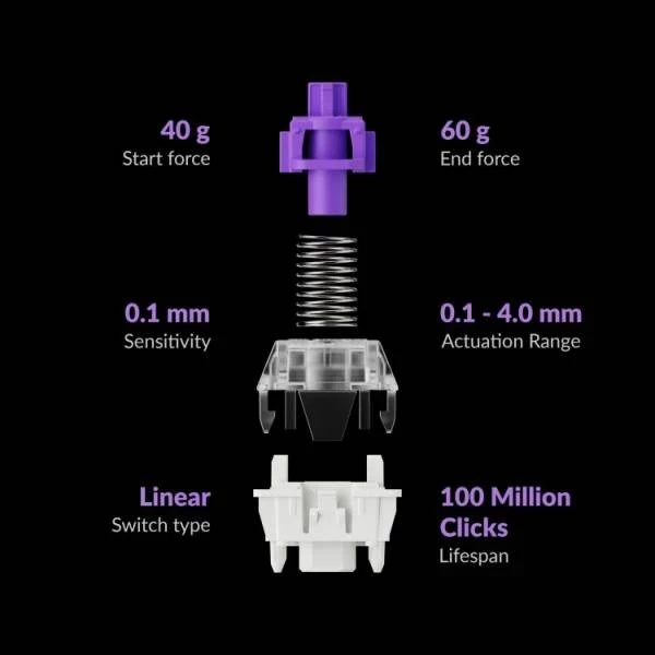 В случае с Gateron 2.0 Hall Effect Magnetic Switch каждый переключатель можно настроить на четыре точки срабатывания в диапазоне от 0,1–4 мм. Иными словами, на каждую клавишу таким образом можно установить до четырёх команд. Для переключателей заявлен ресурс в 100 млн нажатий.