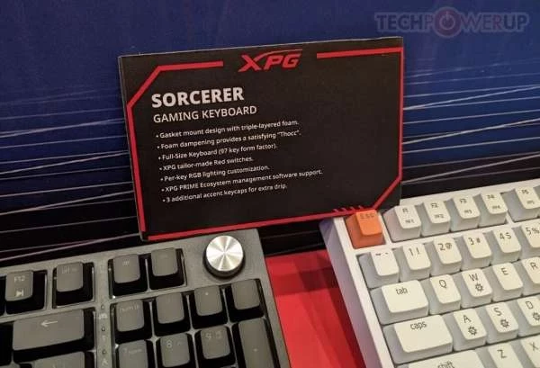 XPG также оставила немного места на стенде для своей новой линейки игровых клавиатур Sorcerer — стандартная модель представляет собой «полноразмерную» плату с форм-фактором 96 %, доступную в черном или белом цвете. Простая эстетика Sorcerer может быть нарушена несколькими (тремя) дополнительными клавишами с акцентом XPG. Серебристый диск управления, похоже, является стандартным креплением. Конструкция с прокладкой и тройным пенополиуретановым слоем обеспечивает изысканный и приятный набор текста. XPG оснастила Sorcerer специальными переключателями Red и системой RGB-подсветки на каждую клавишу (управляется и настраивается с помощью программного обеспечения XPG Prime).