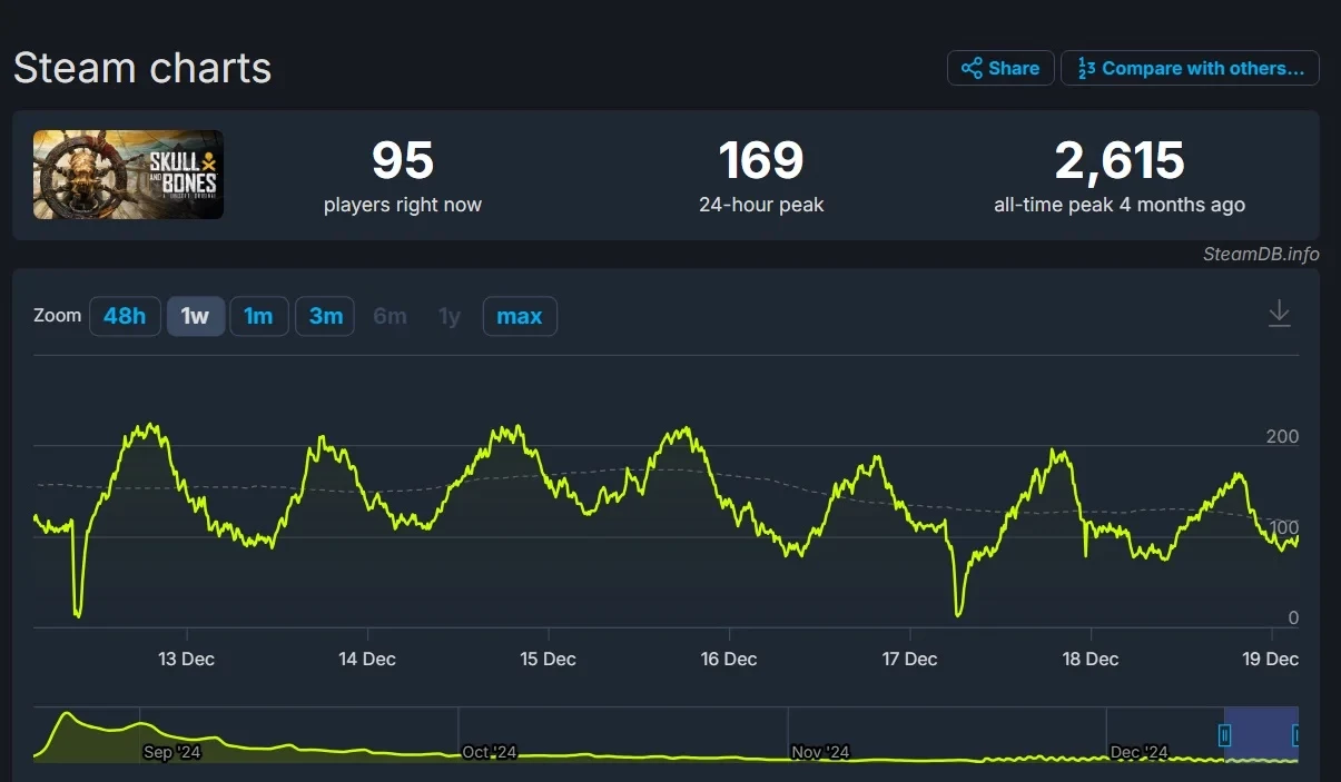 Мы в свою очередь проверили Steam и можем доложить: прямо сейчас в пиратский экшен Ubisoft играют 95 человек одновременно по всему миру. Пиковый онлайн за последние сутки не достиг и 200 игроков.
