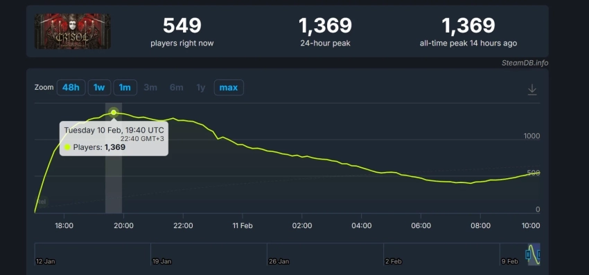 Пиковый онлайн Crisol: Theater of Idols в Steam превысил 1,3 тыс. человек. Рекорд пришёлся на первые часы после релиза.
