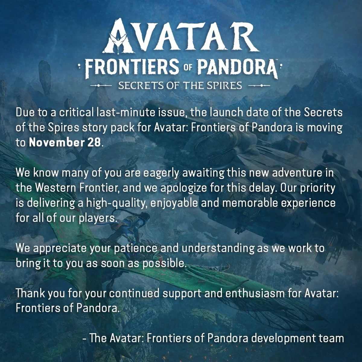 Ещё больше интересных видео на YouTube канале Игромании!Обложка: скриншот Avatar Frontiers of PandoraКомпания Ubisoft решила отложить релиз второго дополнения к Avatar: Frontiers of Pandora с 26 ноября на 28 ноября. Причиной задержки стала критическая ошибка, обнаруженная непосредственно перед релизом.