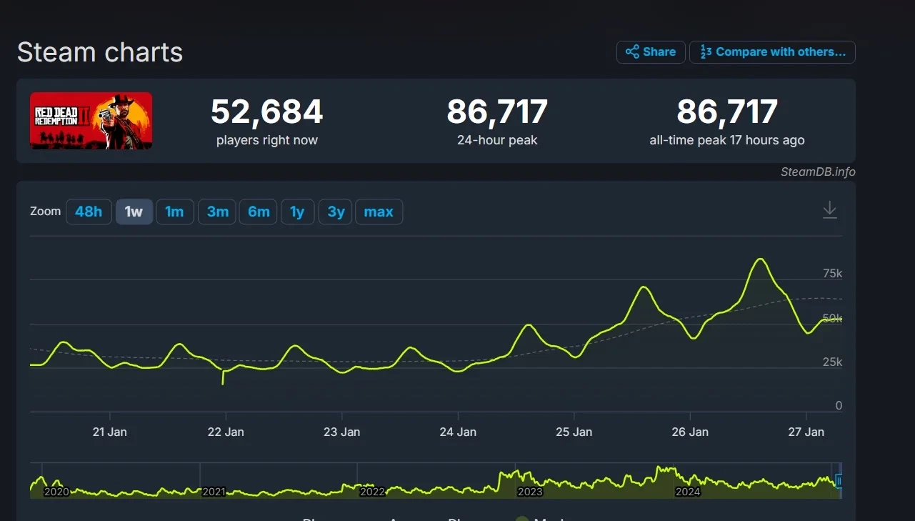 Очевидно, что с достижением новых высот одновременной посещаемости RDR2 помогла распродажа игр Rockstar в Steam, где сиквел вестерна отдают по скидке в 80%.