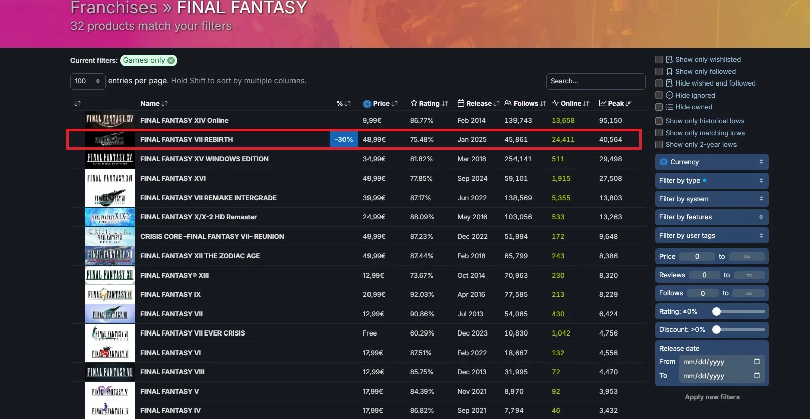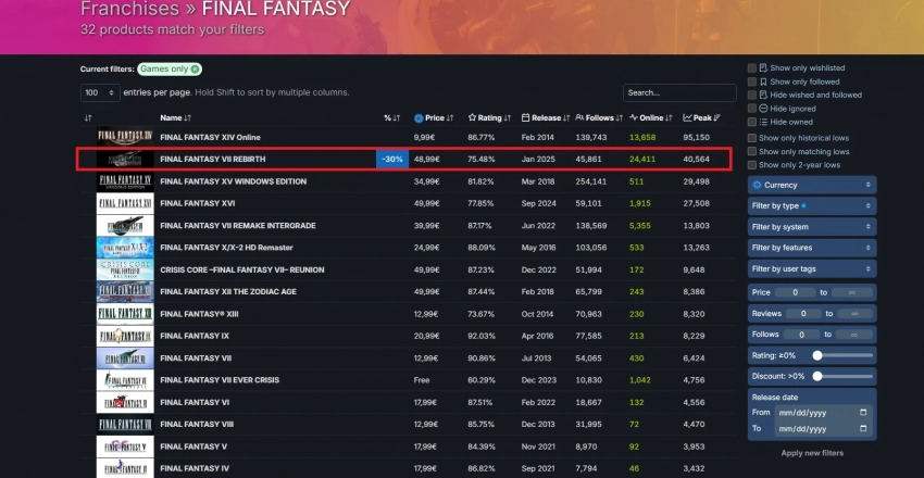 Несмотря на отдельные претензии, PC-версия Final Fantasy 7 Rebirth смогла привлечь большое количество игроков и поставить рекорд в Steam. Пиковый онлайн игры достиг 40 564 человек одновременно. И это местный рекорд для однопользовательских игр серии.