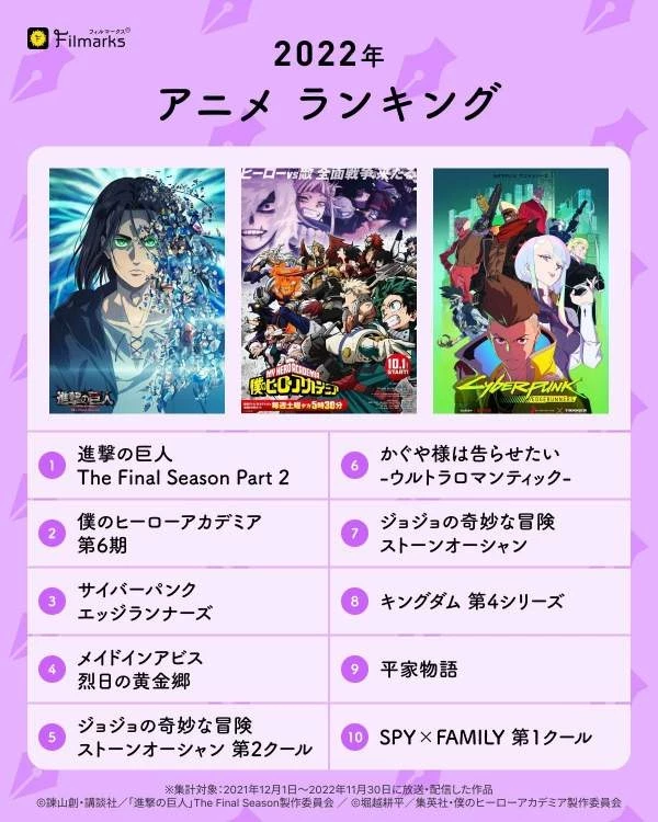 Крупнейший японский агрегатор оценок Filmarks подвел итоги 2022 года, и составил рейтинг лучших аниме прошедших 12 месяцев. Первое место заняла вторая часть финального сезона "Атаки титанов", а второе место занял шестой сезон "Моей геройской академии".